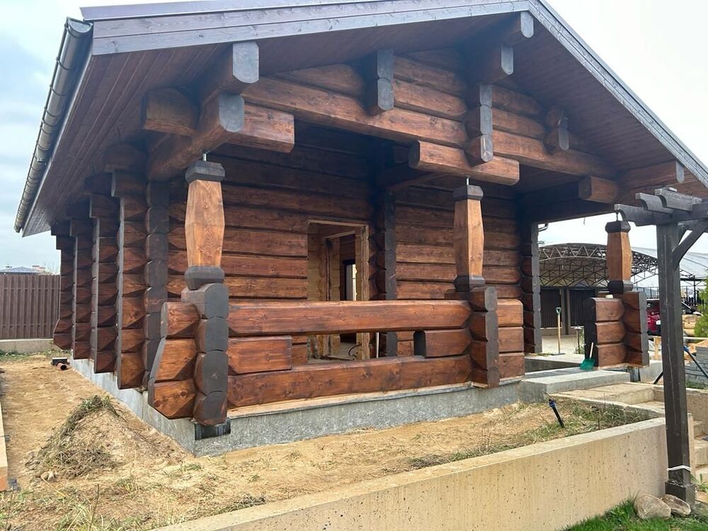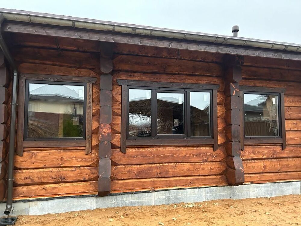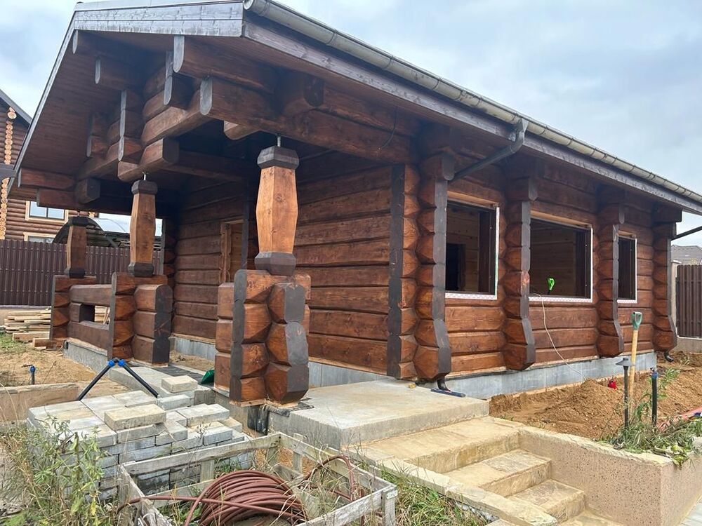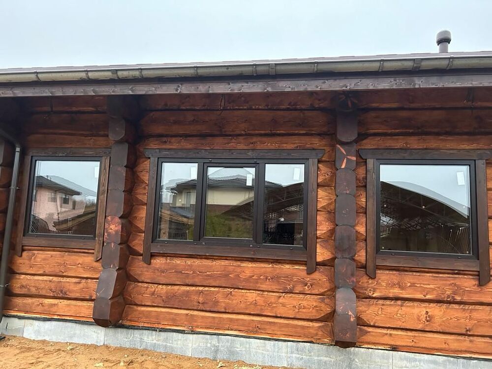 Для покраски фасада заказчик остановился на цвете Pernambuk в линейке масел Berger Outdoor Oil. Цвет получился достаточно брутальный, да и сама постройка очень размашистая. Торцы бревен окрашены тем же цветом. Так как торцы древесины всегда впитывают больше масла и глубже, то они выглядят темнее, чем основной цвет фасада – это естественный процесс. После окраски торцы запечатаныторцевым воском Saicos Stirnkanten-wachs. Этот защитный воск для дерева нужен для того, чтобы предотвратить растрескивание бревен: чтобы те трещины, которые уже есть на торцах, на пошли дальше. С такой обработкой торцы сохраняются достаточно долго.