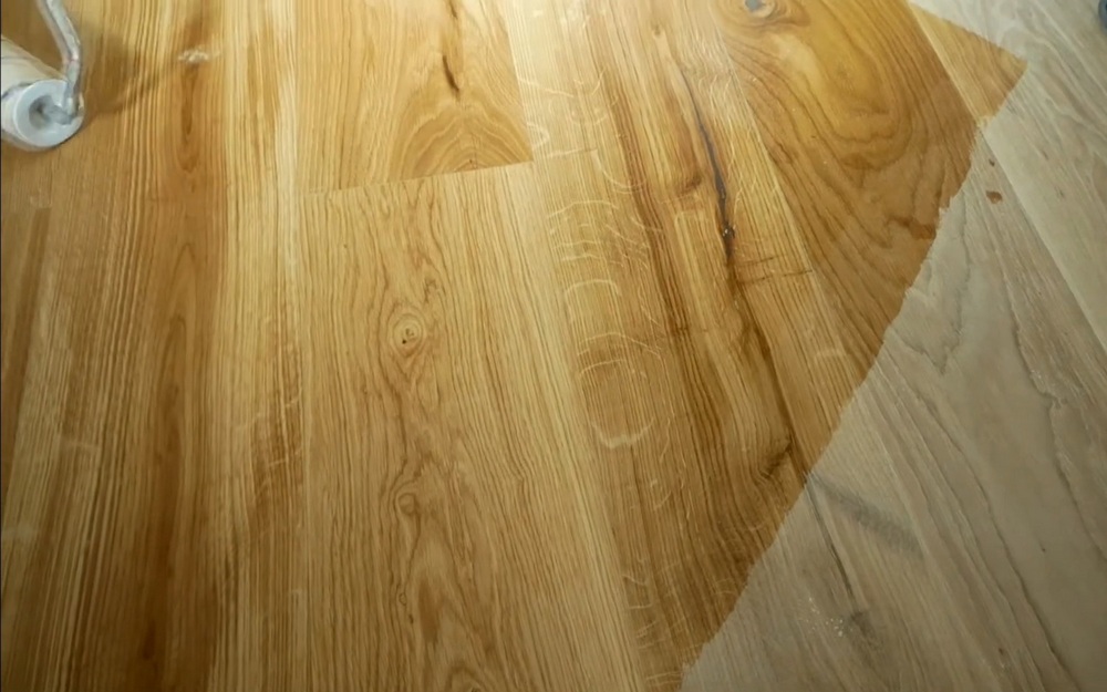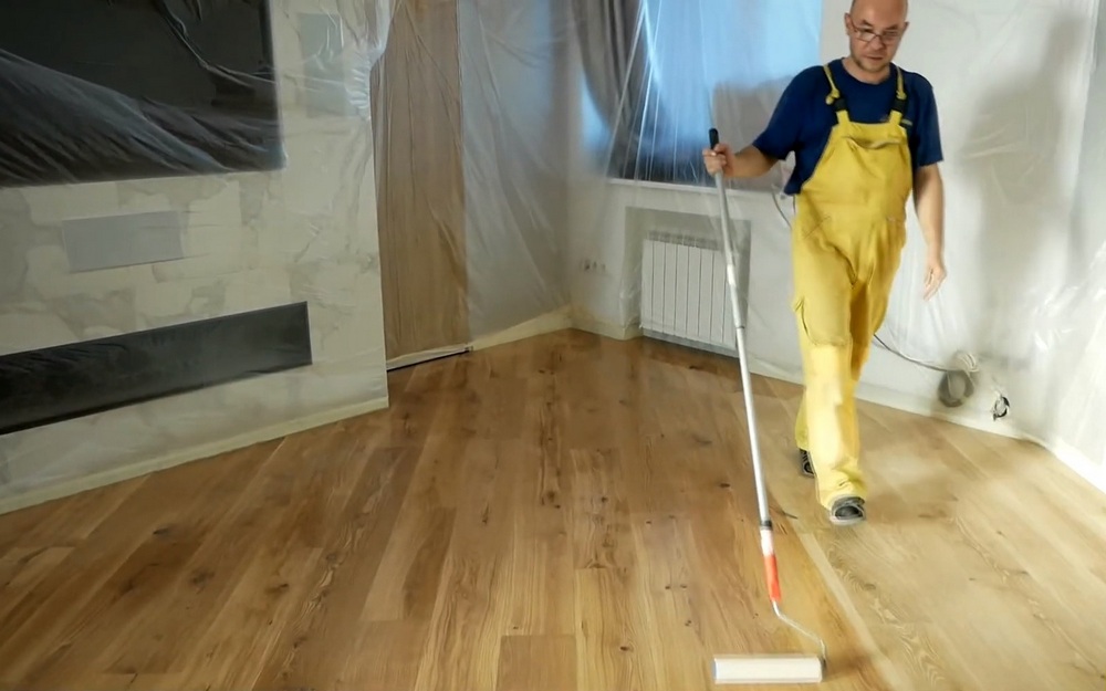 Работы по нанесению паркетного масла выполняем с помощью валика. Перед нанесением масла на основной участок необходимо обработать периметр и труднодоступные участки, например, под батареями, дверные проемы и т.п. Масло с твердым воском наносится в 2 слоя: после высыхания первого слоя примерно через 8 часов можно наносить второй слой.
