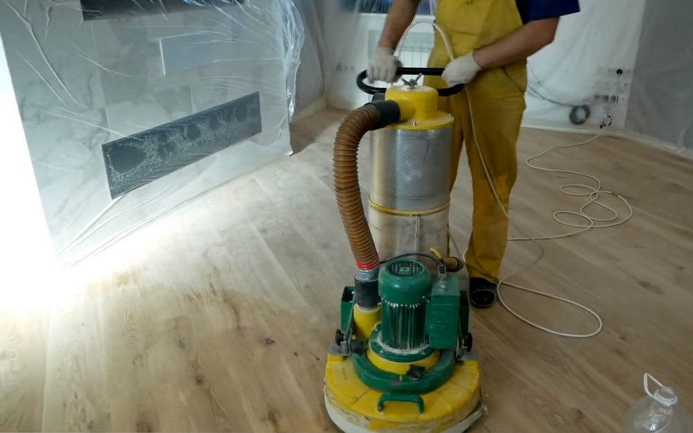 Чем выполняется брашировка? Для этого мы используем машину Trio Lagler со специальными нейлоновыми насадками, которые дают легкую брашь. Для дополнительного эффекта, чтобы браширование было чуть глубже, перед обработкой поверхность пола смачивается водой.