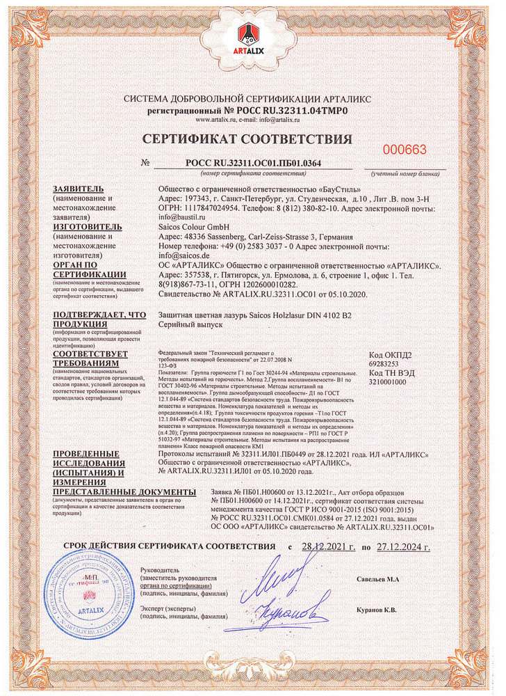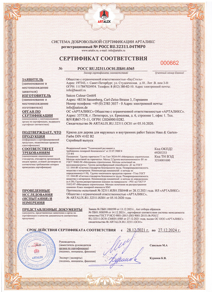 - Качество и надежность. Продукция Saicos сертифицирована по международным стандартам и прошла всесторонние испытания, что подтверждает ее высокую эффективность и надежность. Вы можете быть уверены, что ваши деревянные конструкции получат лучшую защиту от огня и других внешних факторов.