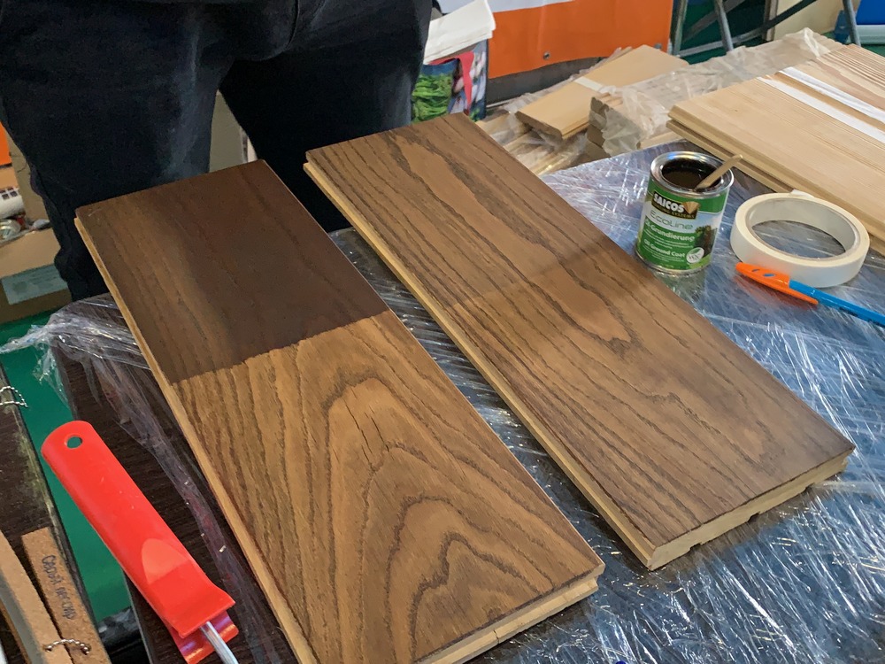 Если вы хотите значительно поменять цвет, то вам придется протонировать свое изделие масляной грунтовкой Ol-Grundierung. Это масло с большим количеством пигмента, оно не является финишным покрытием, но прекрасно тонирует древесину. Чтобы подготовить древесину под тонировку, необходимо очистить ее от грязи или старого покрытия, отшлифовать 120 или 150 абразивом и далее втереть масло Ol-Grundierung. После 8 часов высыхания можно уже будет наносить финишное масло с твердым воском Saicos. Скорость высыхания масла зависит от внешней окружающей среды – от температуры, от влажности воздуха. Чем холоднее, чем больше влажность в помещении, тем дольше будет сохнуть масло. Также важно при высыхании масла обеспечить приток воздуха, потому что масло сохнет оксидативным способом.