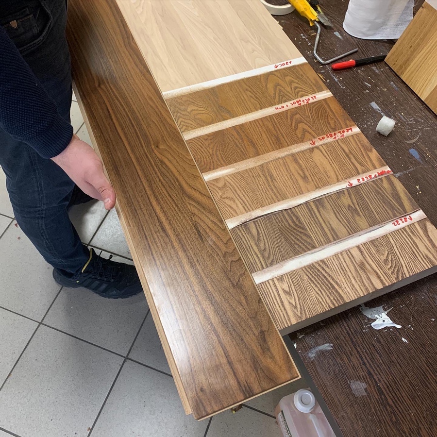 И мы не просто подбираем цвет, а выдаем целую технологическую карту, где подробно указываем, каким образом был отшлифован образец (какие шлифовальные машины использовались и какой необходим номер зерна); указываем последовательность нанесения масел, способ нанесения и используемые инструменты (падом, ветошью врастирку, тонким слоем валика и т.п.). Все это мы прописываем, чтобы мастера на объекте могли в точности повторить технологию нанесения.