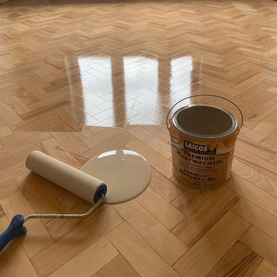 Но мы не останавливаемся на подборе цвета. Дополнительно мы наносим защитное финишное покрытие, потому что оно влияет на итоговый визуальный результат: оно может поменять оттенок, глубину, насыщенность цвета и т.п. В технологической карте, которую мы выдаем клиенту, мы также указываем, какое использовалось финишное покрытие, какая степень глянца у него была, какое количество слоев наносили и каким способом. В качестве защитного покрытия мы используем лаки или масла, в частности паркетное масло с твердым воском Premium Hartwachsöl.