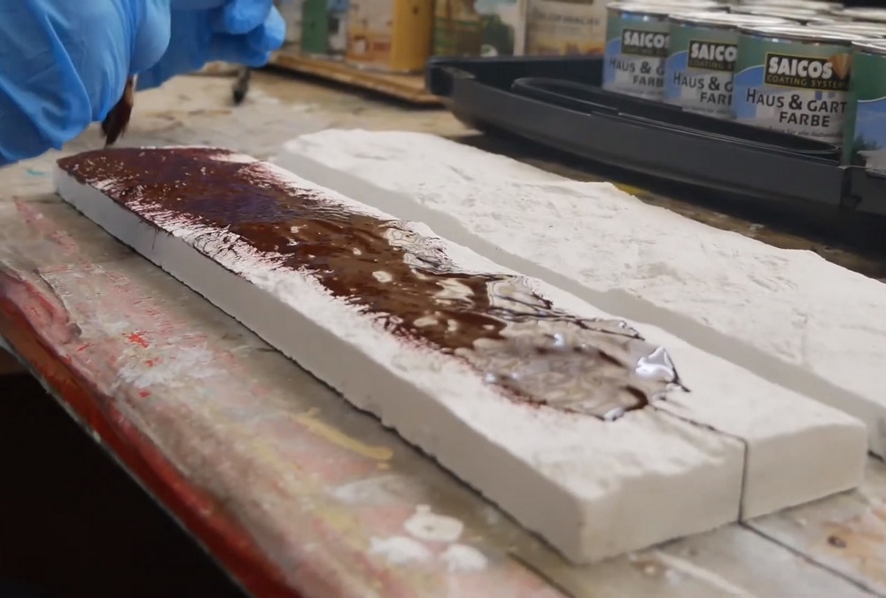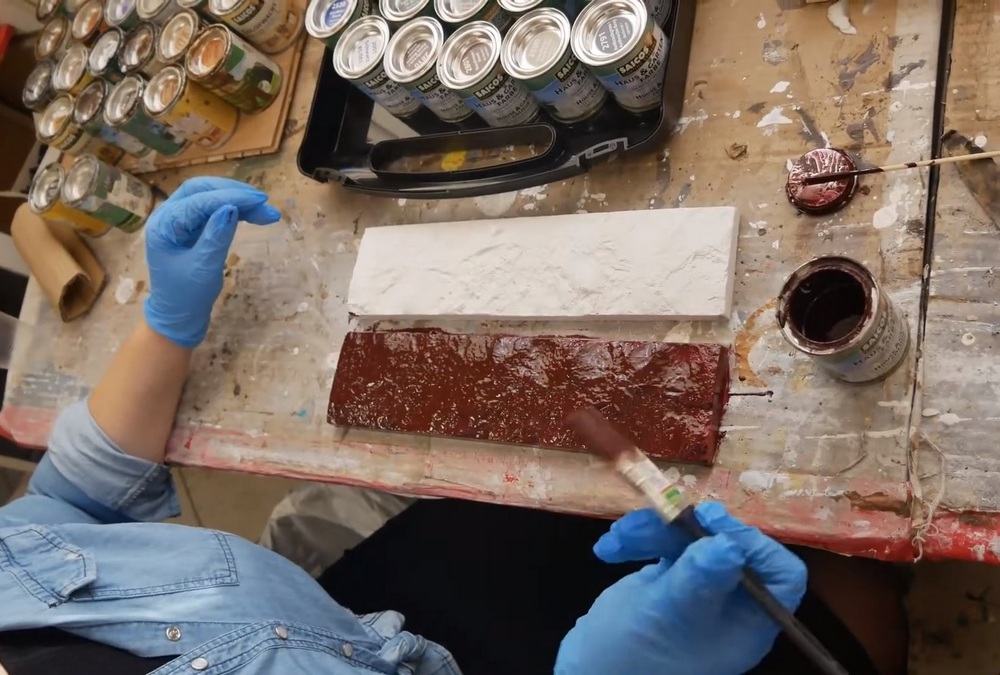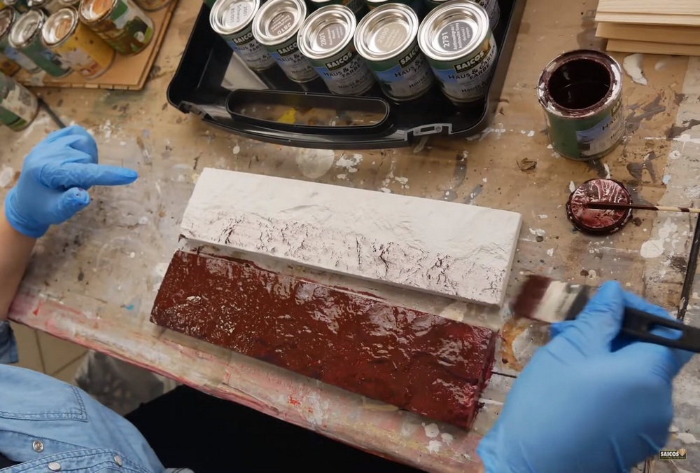 Для создания декоративного эффекта достаточно всего лишь одного слоя масляной краски Haus & Garten-Farbe. Она хорошо растягивается по поверхности кирпича и перекрывает полностью своими пигментами белый оттенок материала.