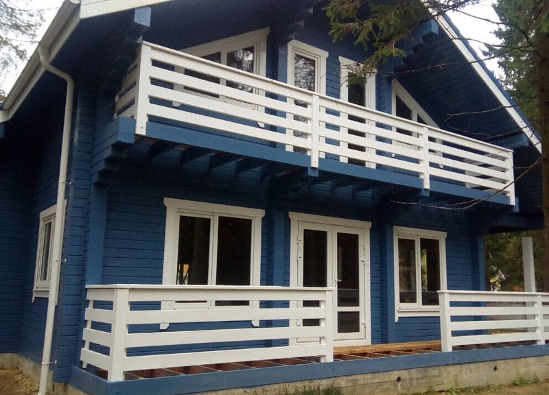 Завершим подборку фасадов давним нашим объектом – дом был покрыт маслом Haus & Garten-Farbe синего и белого цвета. Изначально сруб был покрыт какой-то лакокраской, это покрытие простояло порядка 3 лет, после чего хозяин дома принял решение отшлифовать фасад и обновить цвет. Его пожеланием было – чтобы покрытие стояло долгие годы. Haus & Garten-Farbe отлично с этим справляется: мы подбирали цвет в 2016 году, и до сих пор вот уже 6 лет покрытие отлично держится и прекрасно выглядит.