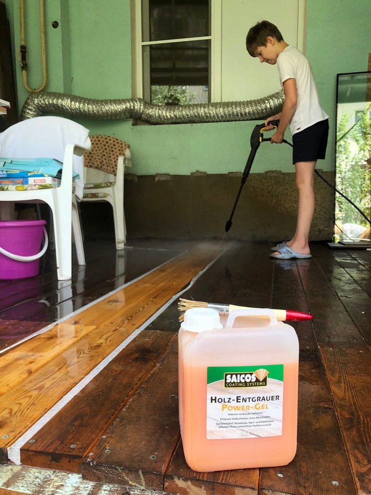 Если сам по себе настил хорошо сохранился, и требуется лишь обновление деревянной террасы, то мы рекомендуем использовать средство для очистки древесины Saicos Power Gel, который убирает зеленый налет, посеревший слой древесины, загрязнения. После обработки гелем террасу нужно хорошо промыть водой, высушить и можно покрывать маслом в 2 слоя.