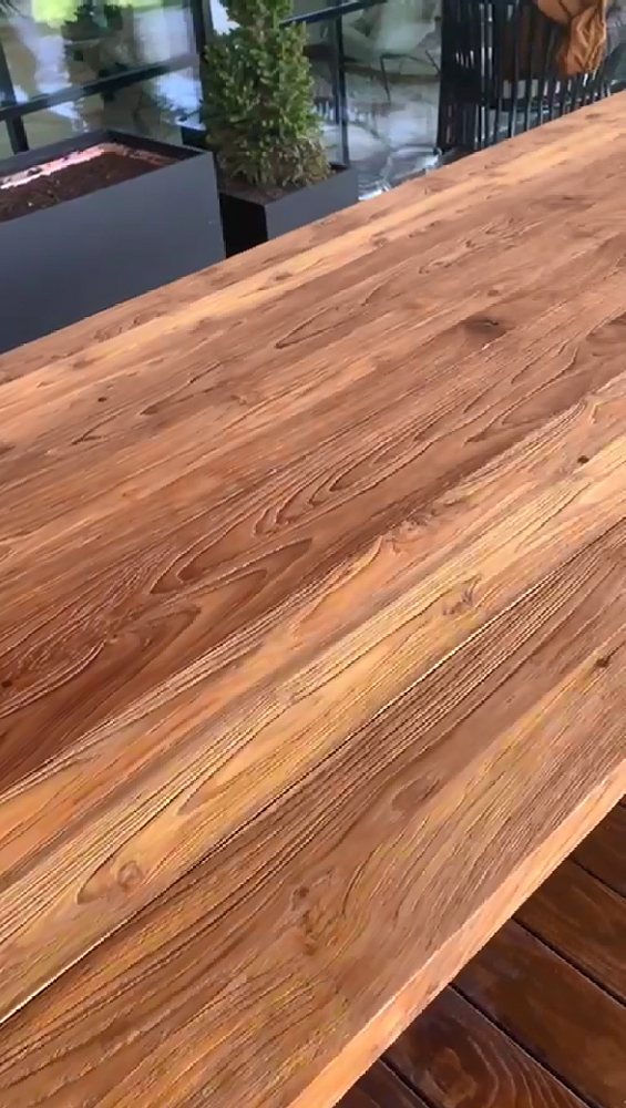 Объект находился в коттеджном поселке Honkanova в Ленинградской области. Наш «пациент» – большой деревянный стол, предположительно из лиственницы, который имеет обширные поражения плесенью. Столешница глубоко браширована и изначально покрыта неизвестным составом. Со слов клиента, стол простоял какое-то время, будучи накрытым полиэтиленовой пленкой, в результате чего в процессе эксплуатации на древесины выступила плесень. Наша задача была – убрать плесень и вернуть столу привлекательный внешний вид.