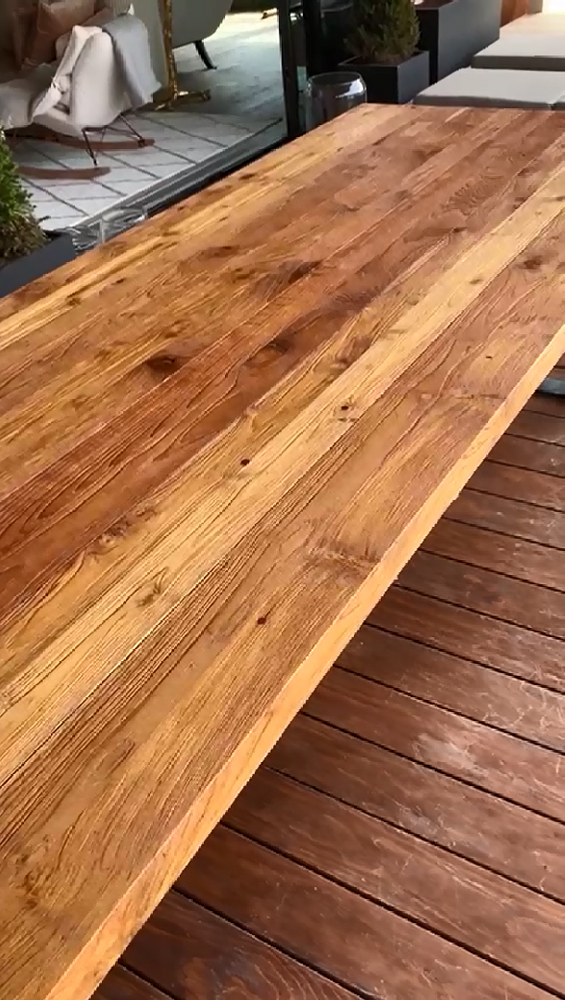 На момент выполнения работ погодные условия не позволяли нанести полноценную защиту: столешница стоит на уличной террасе, и для соблюдения технологии нанесения защитного масла требуется определенная температура воздуха. Но в дальнейшем эти работы, конечно, были выполнены, а клиент остался доволен результатом.