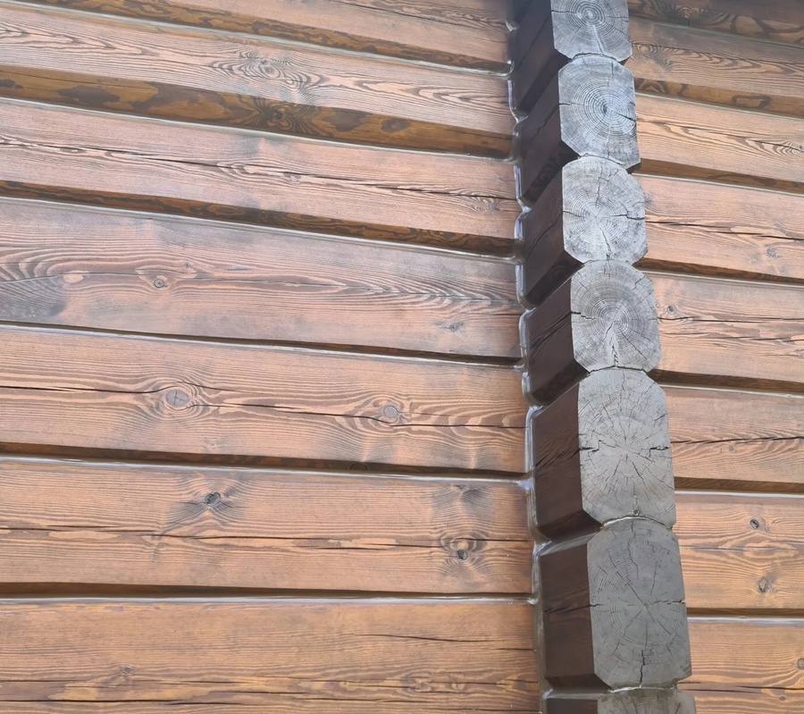 Был еще один негативный случай, связанный с пузырением герметика. С такой проблемой мы впервые в своей практике столкнулись только в прошлом году. Мы нанесли коричневый герметик на окрашенное бревно темного цвета, и на 3 солнечных сторонах дома, кроме теневой, у нас герметик покрылся большими волдырями.