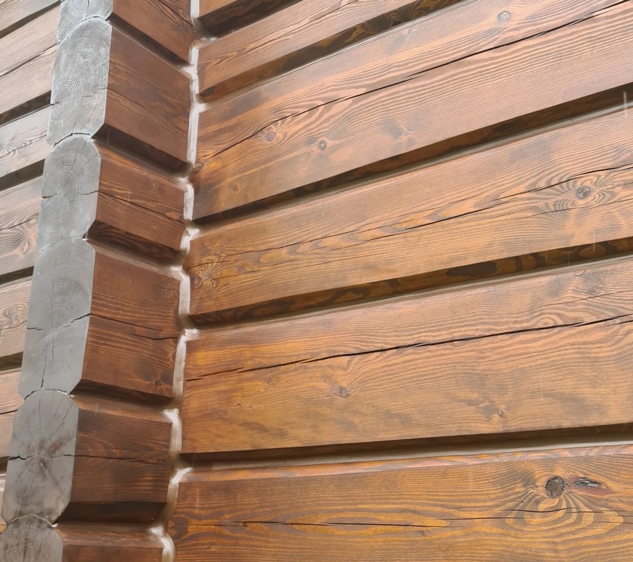 Начну с положительного примера. Наш самый первый объект был в 2014 году в дер. Балабаново Московской области. Это был большой 2-этажный дом из оцилиндрованного бревна площадью примерно 12х12 м. Он уже простоял несколько лет без крыши, был темно-серого цвета, и это был наш первый опыт работы с герметиком. Мы вставили окна, накрыли кровлю и занялись фасадом. Хозяин привез нам герметик и попросил обработать им сруб с двух сторон. Кроме дома, мы также обработали герметиком 2-этажную баню 7х7 м, то есть фактически нанесли несколько километров этого герметика. Мы наносили герметик на чисто отшлифованное бревно и потом красили.