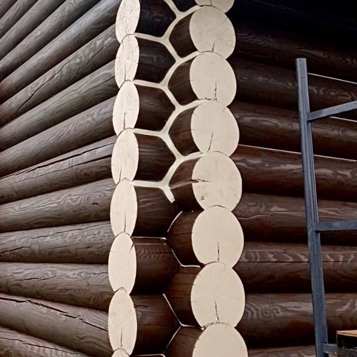 Для работы с герметиком внутри помещений неважно, какое у вас бревно. Тут рекомендуем наносить герметик после 1-2 (а лучше всего 2) сезонов отопления, потому что при включении отопления внутреннюю часть бревен начинает воротить, усушка идет сильнее, усадка дома тоже. Бывает так, что дом 3 года стоит без отопления и кажется, что никакой усадки уже нет, но после включения отопления этот процесс запустится. Так что ждем 2 полноценных отопительных сезона.