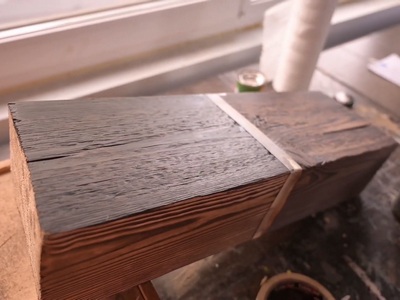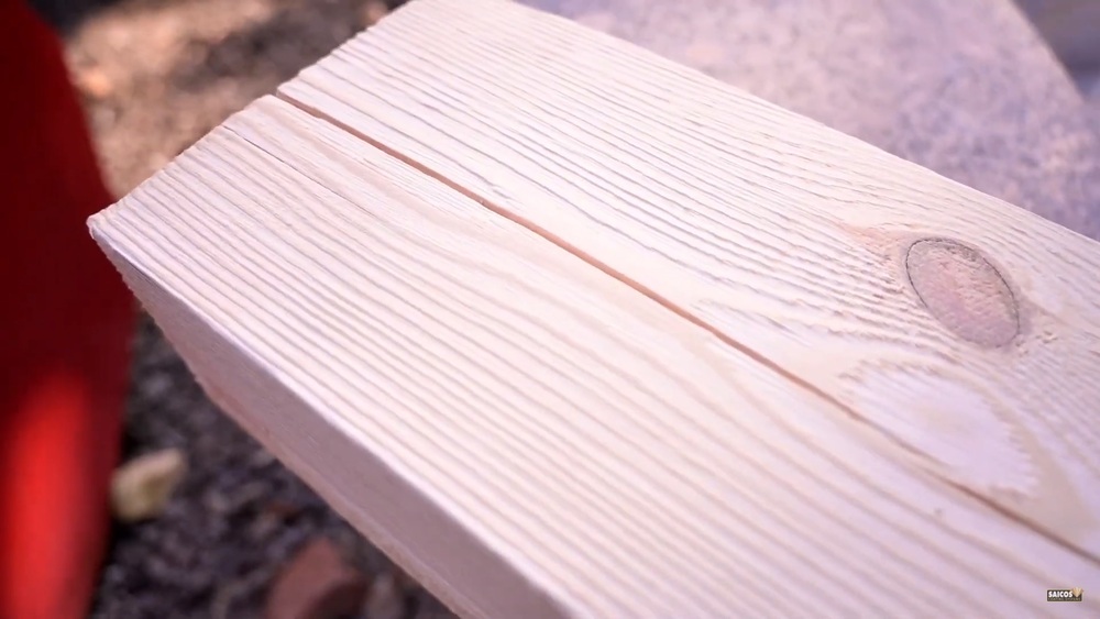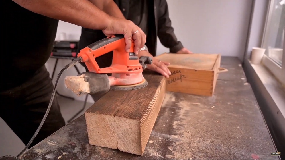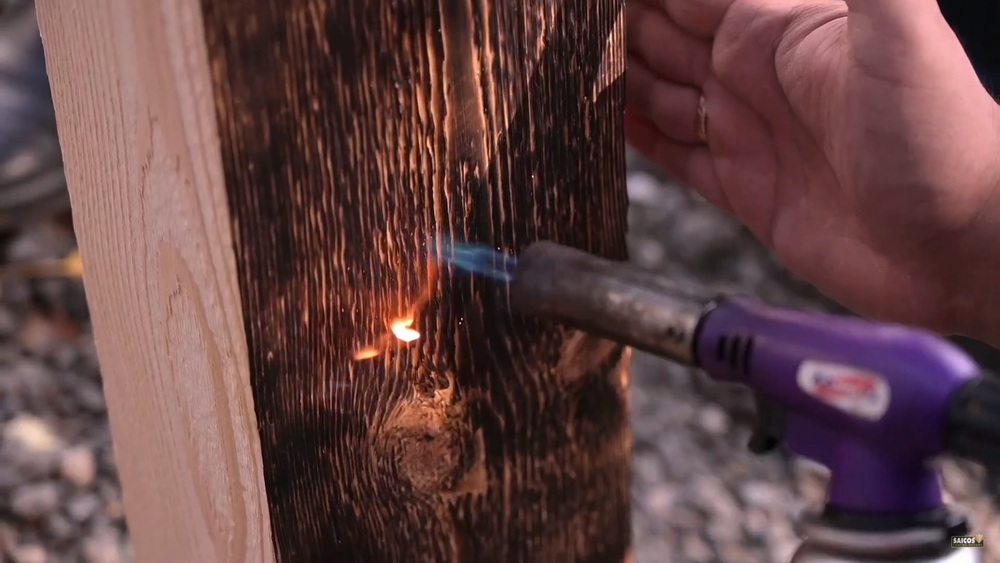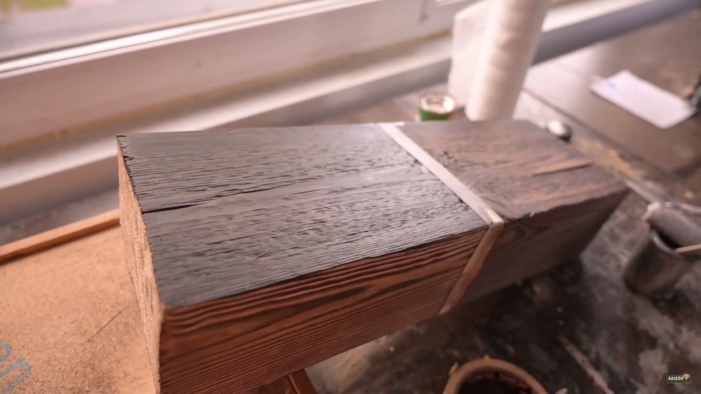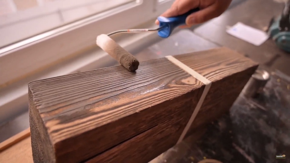 Так как клиент хотел получить эффект состаренной древесины, то перед покраской мы сначала выполнили брашировку бруска машинкой Makita, затем взяли горелку и обожгли древесину. Далее почистили поверхность, удалив пыль и остатки волокон, и приступили к покраске.
