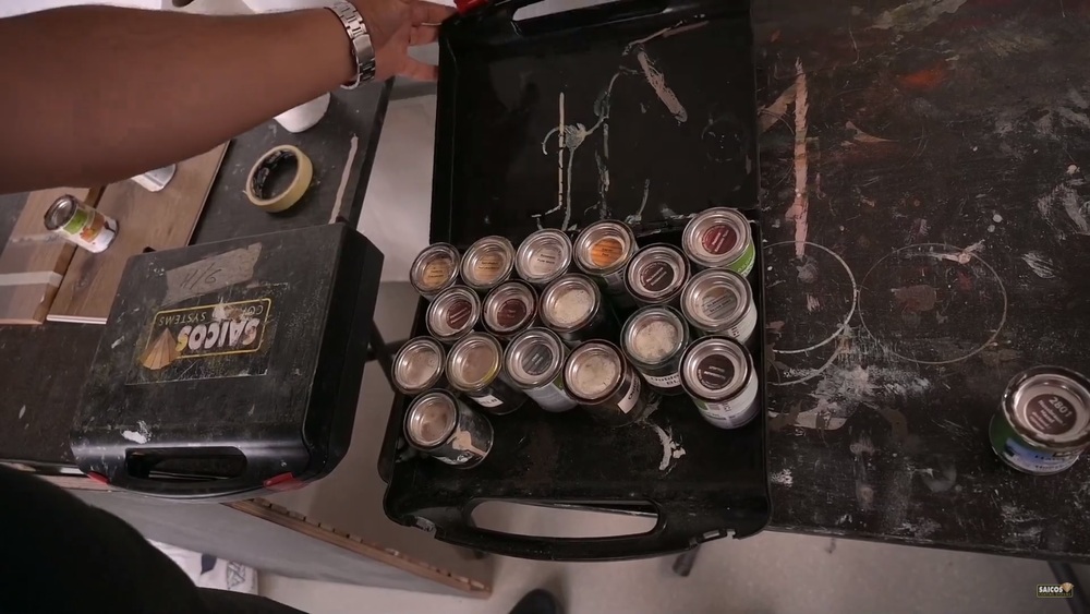 Для пробных выкрасов у нас есть удобные чемоданчики с образцами масел. Перед покраской масло нужно тщательно перемешать – не просто взболтать рукой, а хорошо перемешать палочкой, чтобы пигмент полностью распределился, и мы получили однородный масляный состав. Далее мы нанесли масла валиком и растерли по поверхности.