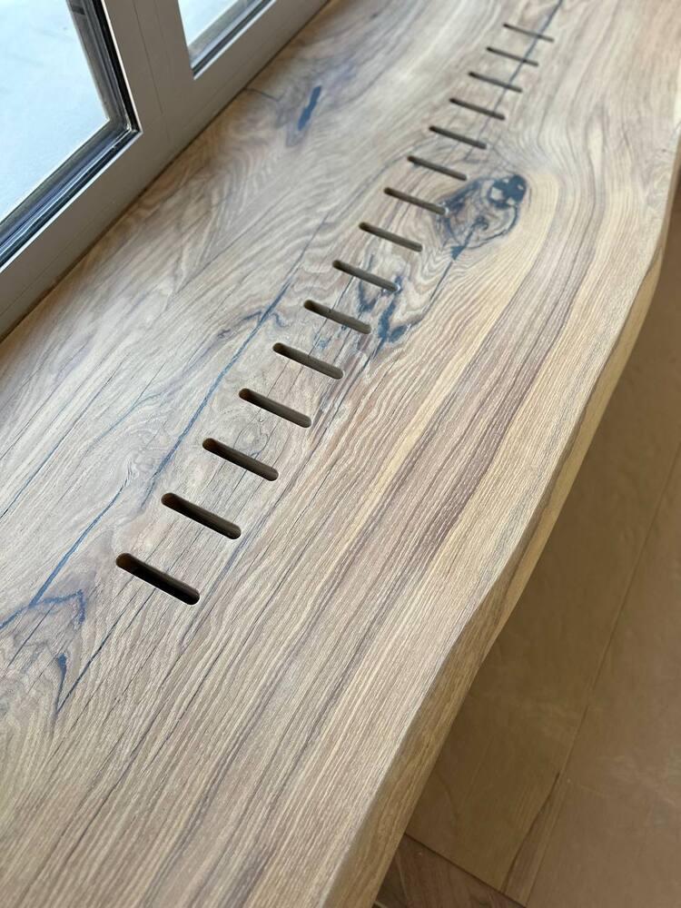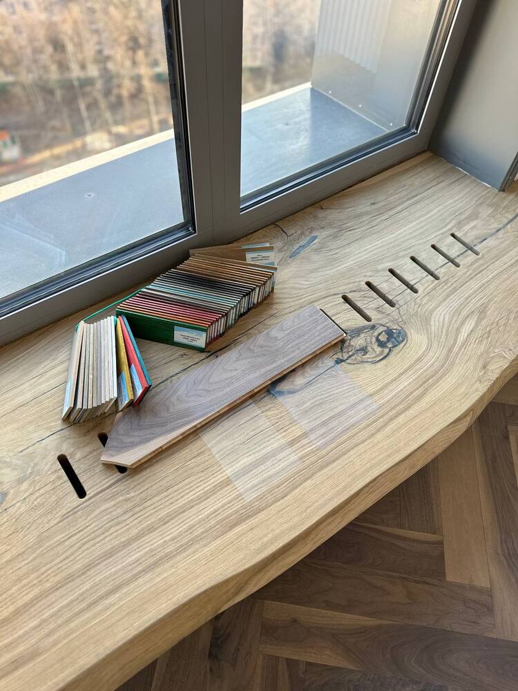 После этого к ним поступил заказ на изготовление и полное декорирование подоконников. Подоконники сделаны из дубового слэба (спила), который также потребовалось затонировать в один цвет и в одном стиле с полом, чтобы все это вместе гармонично сочеталось в интерьере.