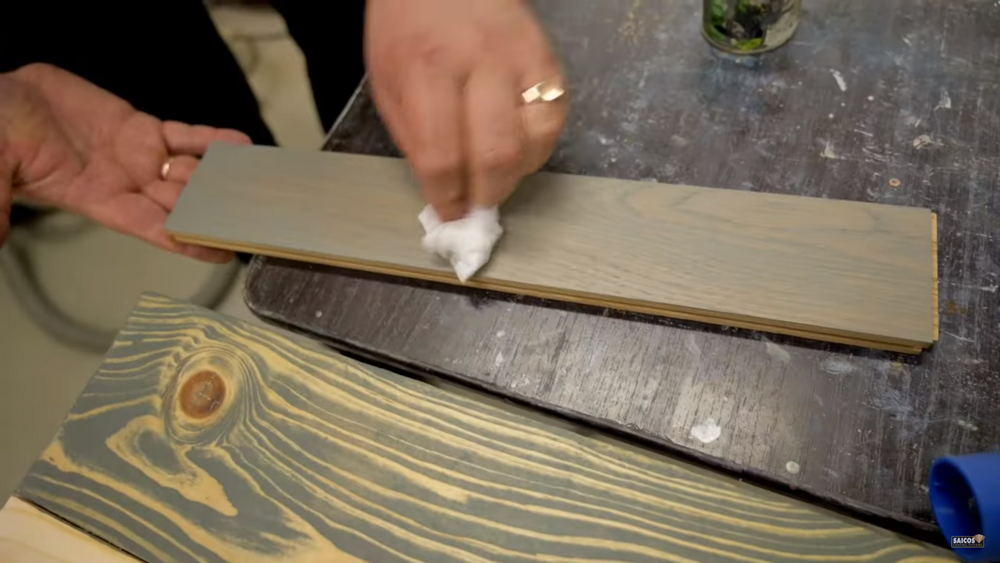 Если говорить про тонировку стен, потолков и других ненагруженных поверхностей, у Berger масло BaseOil подходит для всех вариантов, а у Saicos есть еще одно решение – цветной декоративный воск Colorwachs. Это масло с пигментом цвета и с небольшим содержанием воска для защиты от влаги и разных механических воздействий. Такое покрытие достаточно легко потом обновляется без перешлифовки – достаточно сделать влажную уборку, высушить и нанести еще один слой такого же масла. Для примера нанесли его на сосну, потому что это самый распространенный материал для стен и потолков в нашем регионе.