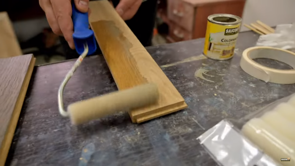 Тонирующие масла обычно валиком и кисточкой не наносят. Можно, конечно, нанести и потом машиной растянуть. На больших объемах мы можем прибегнуть к кисти или валику – по углам нанести и потом это все дело располировать.