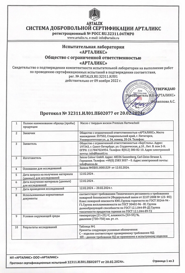 Специальное цветное масло с твердым воском для дерева Premium Hartwachsöl разработано для деревянных поверхностей и паркета. В 2021 году на это масло впервые получен, а в 2024 году подтвержден сертификат пожарной безопасности класса КМ1, подтверждающий следующие характеристики: