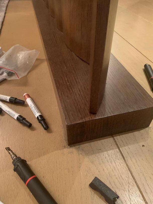 Мягкий воск наносится шпателем или натирается поперек повреждения с одновременным уплотнением, после чего шпателем удаляются излишки. При необходимости производится выравнивание цвета и текстуры поверхности ретуширующими фломастерами. Для защиты заделанного повреждения от загрязнений и деформации, а также для выравнивания степени глянца, рекомендуется закрепление ремонтного места фиксирующим лаком.