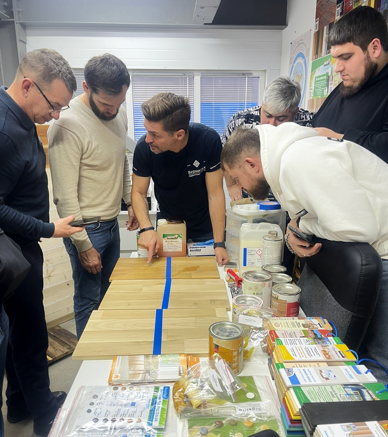 - Проведение обучения по работе с покрытиями для дерева. Наша команда проводит обучающие семинары и практикумы для строителей и отделочников, дизайнеров и всех мастеров или любителей, работающих с древесиной. Научим правильно подбирать состав по типу и назначению древесины, а также дадим подробную технологию нанесения масел, чтобы они защищали ваш дом долгие годы.