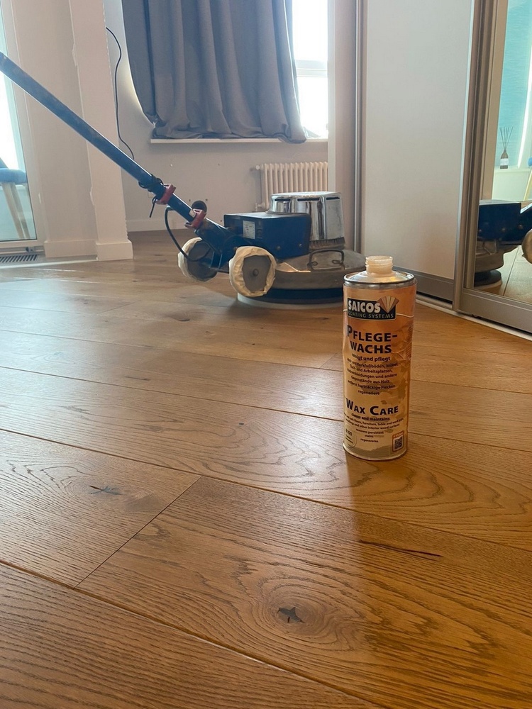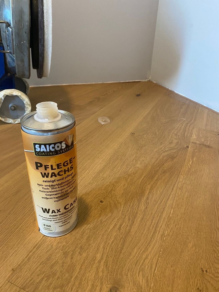 Восстановить внешний вид паркета, придать ему блеск и убрать небольшие потертости, можно с помощью специального средства по уходу Saicos Pflegewachs. Этот полировальный воск подходит для очищения всех видов полов из древесины и пробки, покрытых маслом или воском, столешниц и рабочих поверхностей, мебели и обшивки из древесины и прочих деревянных изделий.