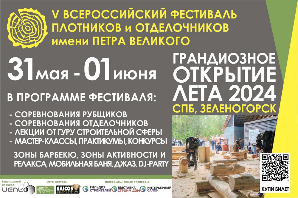 Уважаемые коллеги и партнеры! Мы открыли продажу билетов на V Всероссийский фестиваль плотников и отделочников. В этом году соревнования пройдут 31 мая и 1 июня. Местом проведения традиционно станет наша производственная площадка в г. Зеленогорск (координаты 60.237863,29.686843).