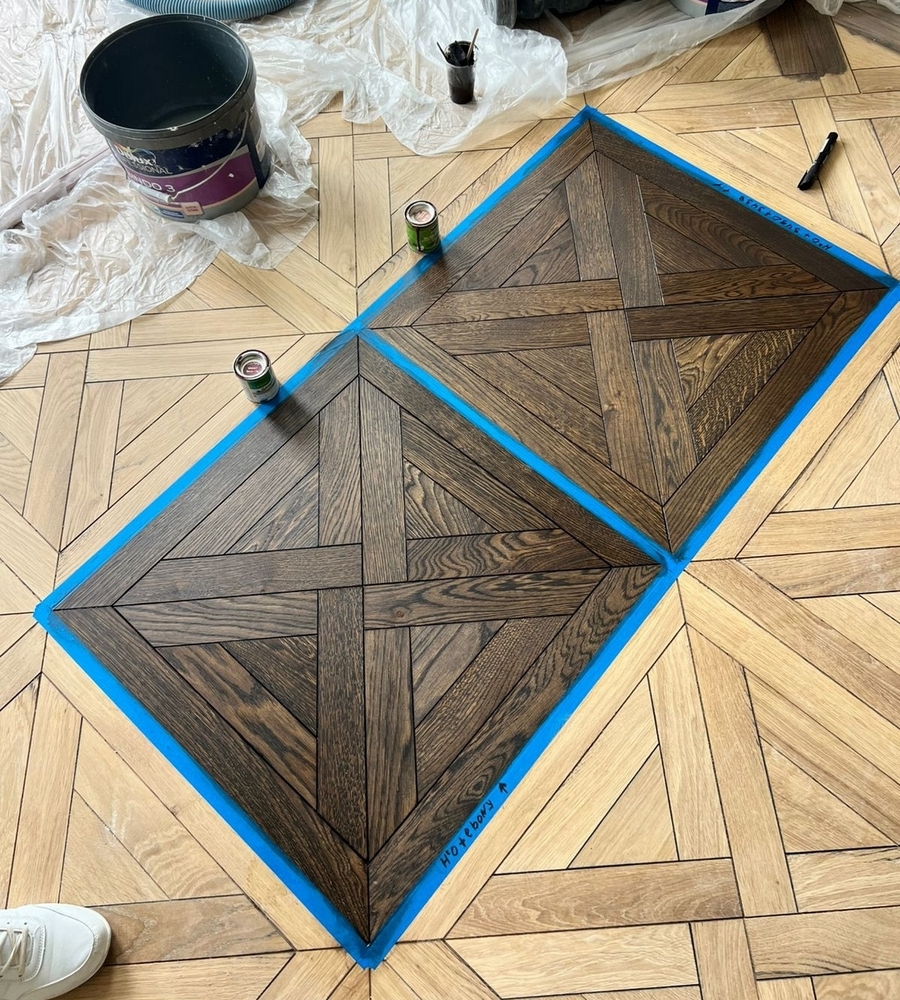 На втором объекте также помогали клиенту выбрать идеальный оттенок паркета под интерьер помещения. Показали выкрасы, обсудили детали, сравнили варианты, как цвет отображается на свету и в тени – клиента все устроило, и мы согласовали цвет.