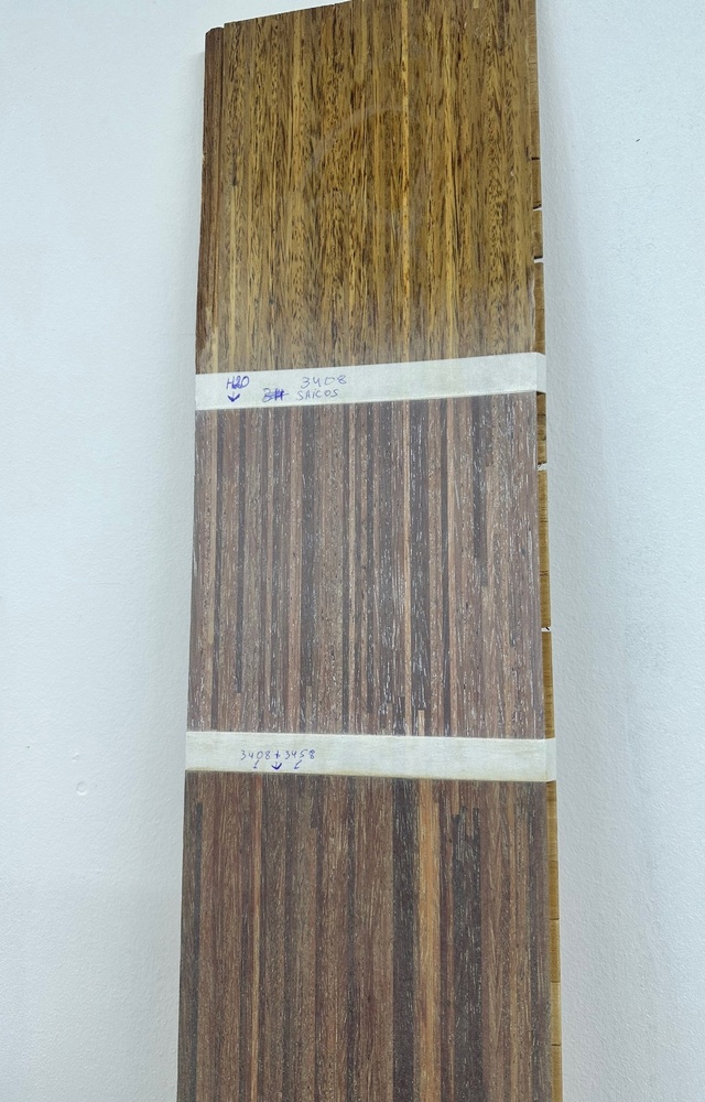 В итоге из предложенных вариантов клиент отметил 2, которые ему наиболее понравились. Оба варианта были покрыты цветной масляной грунтовкой Ol-Grundierung арт. 3458 цвет Дуб и сверху в качестве финишного защитного слоя бесцветным матовым маслом с твердым воском Premium Hartwachsol. Разница в них в том, что один вариант с поднятым ворсом водой, другой – без. Интересно, что оба варианты визуально очень близки друг другу – так они вглядят именно на мербау. Например, на дубе они выглядели бы совсем иначе, и разница была бы более заметной.