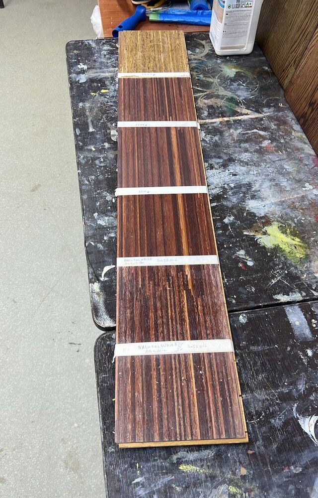 Мы изначально отшлифовали доску и покрыли ее разными покрытиями, как обычно, подписывая рецептуру. В том числе мы пробовали выполнять тонировку с предварительным поднятием ворса древесины с помощью воды.