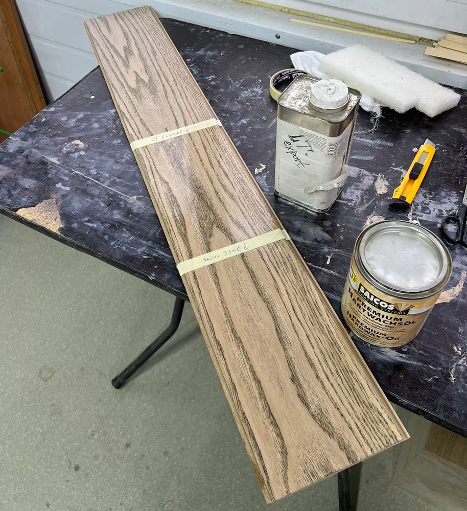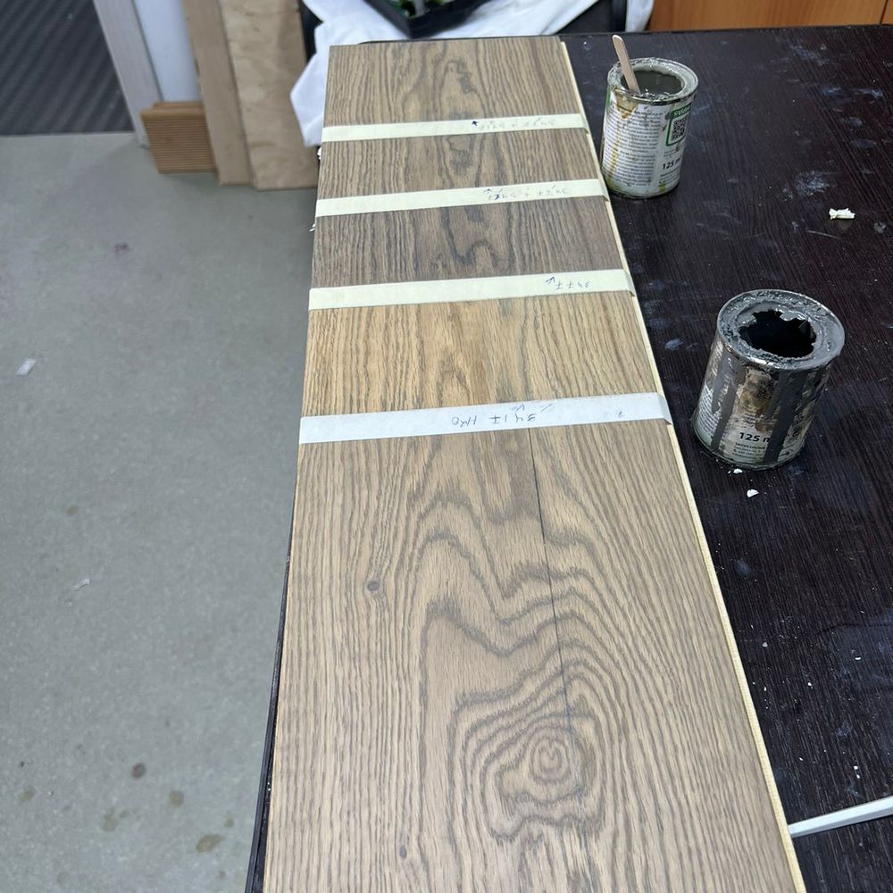 Одна клиентка принесла нам доску шпонированного ламината, но шпон на нем настолько тонкий, как будто его вообще нет. Клиентка сказала, что пролила воду на него и обнаружила, что как такового защитного покрытия на ламинате нет. В связи с этим она попросила нас сделать тест и подобрать защитное покрытие. Мы сделали выкрасы с использованием однокомпонентного масляного лака на растворителе Berger LT-Export и масла с твердым воском Saicos Premium Hartwachsöl арт. 3305 (матовое).