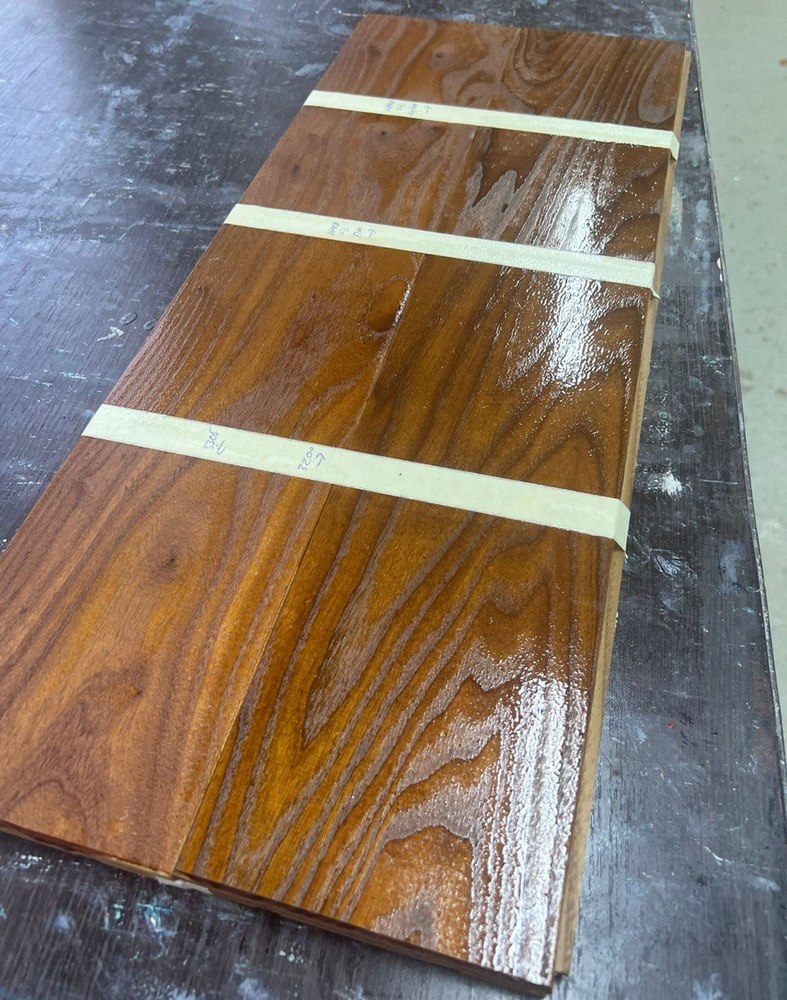 Еще один подбор цвета – на этот раз для доски из термоясеня. Задача стояла – нанести 4 вида покрытий, которыми стали масло с твердым воском Saicos Premium Hartwachsöl арт. 3305 (матовое) и арт. 3200 (шелковисто-матовое), а также масло Berger экстраматовое и полуматовое.