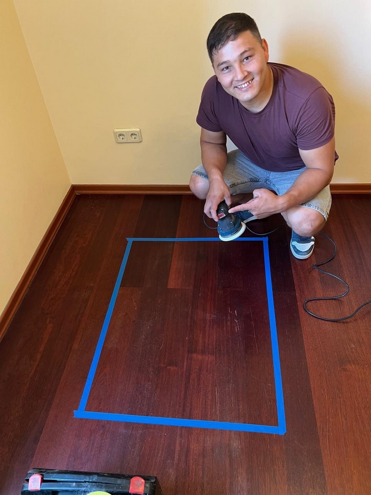 На объекте Виктор Смирнов и Али Мусаев сделали несколько выкрасов с помощью масла Berger BaseOil. При этом некоторые фрагменты пола сделали с водой, чтобы поднять волокна древесины – в этих местах цвет получился более насыщенным.