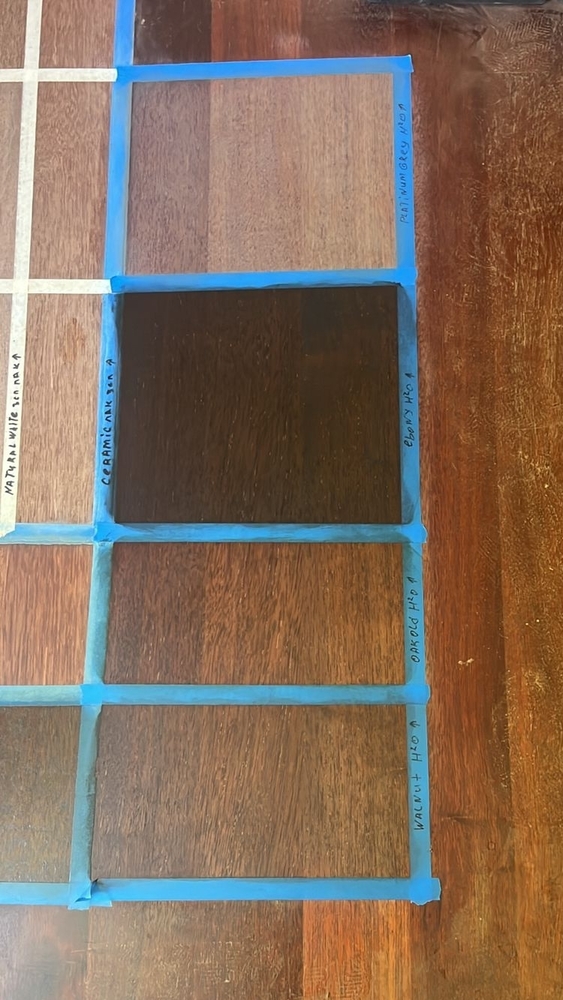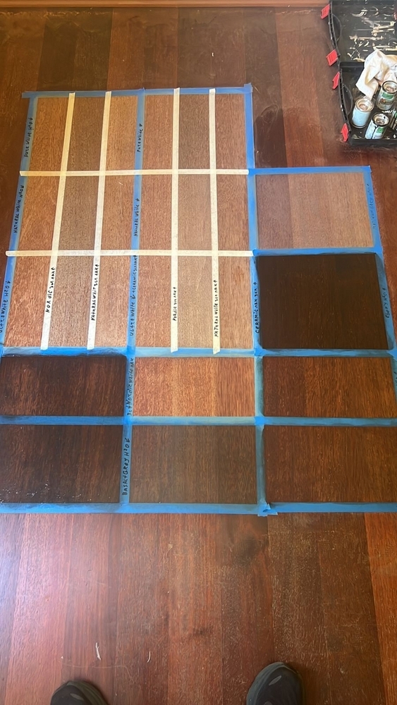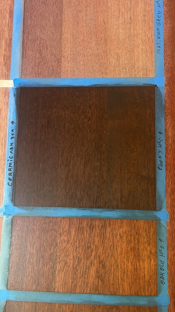 Действие второе. Заказчик решил теперь рассмотреть более темные оттенки, и мы снова сделали несколько выкрасов, а затем после тонировки дополнительно приезжали, чтобы покрыть фрагменты паркета лаком, который выбран для финишного покрытия.