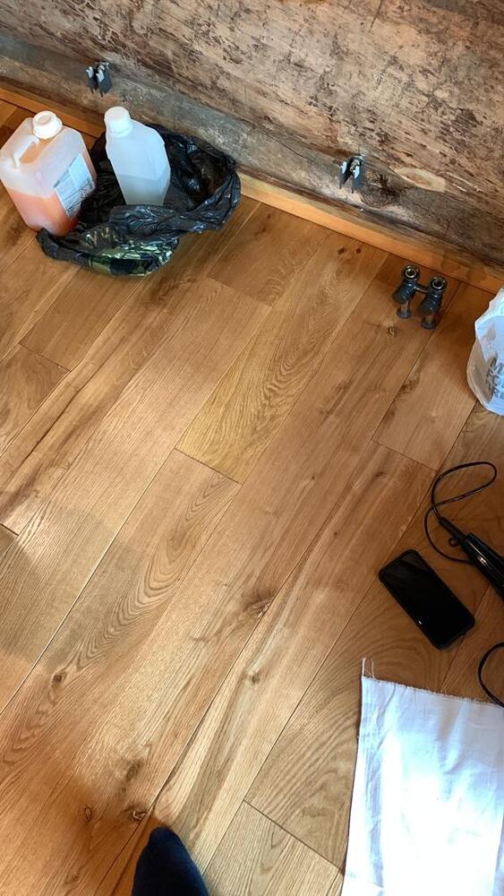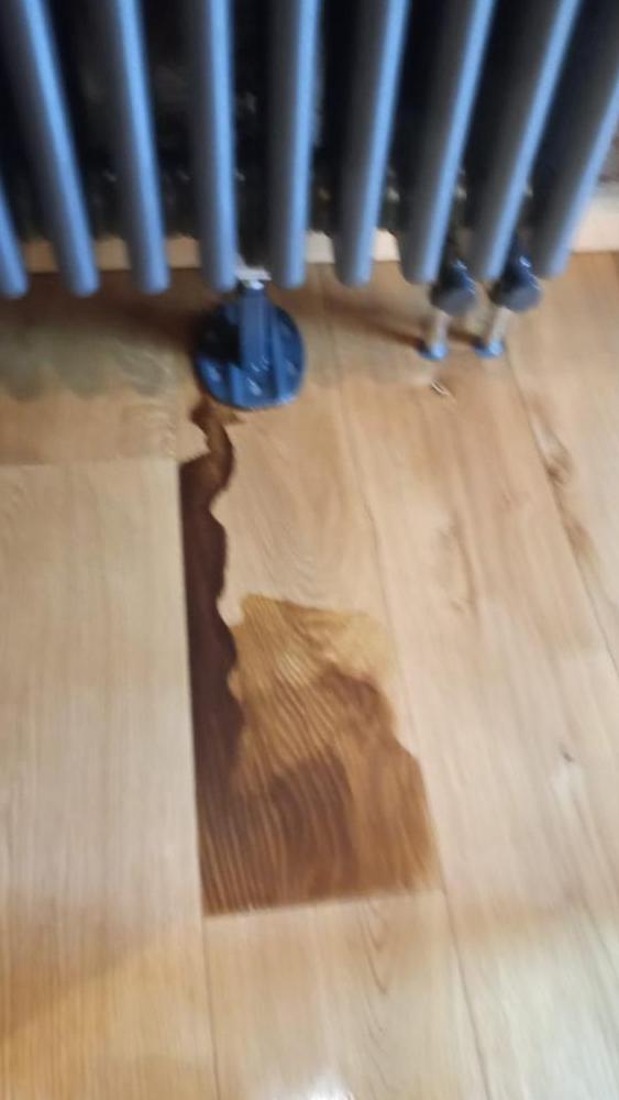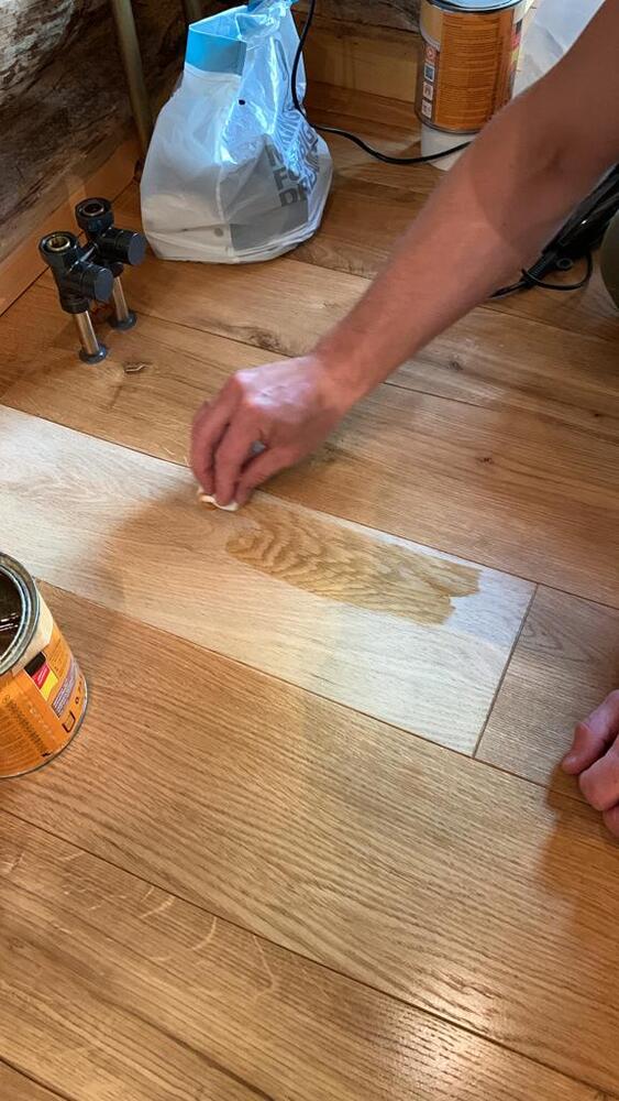 Пятно от антифриза смогли удалить при помощи нашего топового средства для очистки древесины Saicos Power Gel, усилив его перекисью водорода 24%. После работы химии дерево пришлось немного тонировать, так как оно выбелилось слишком сильно. Далее паркет покрыли двумя слоями масла с твердым воском Saicos Premium Hartwachsol арт. 3200 (шелковисто-матовое), которое ранее было нанесено на весь паркет в доме.
