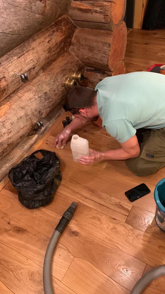 Работу выполнили наши коллеги из паркетной компании «Вернисаж» на объекте в Санкт-Петербурге. Там в частном доме на паркет протек антифриз, а паркет ранее был покрыт маслом с твердым воском.