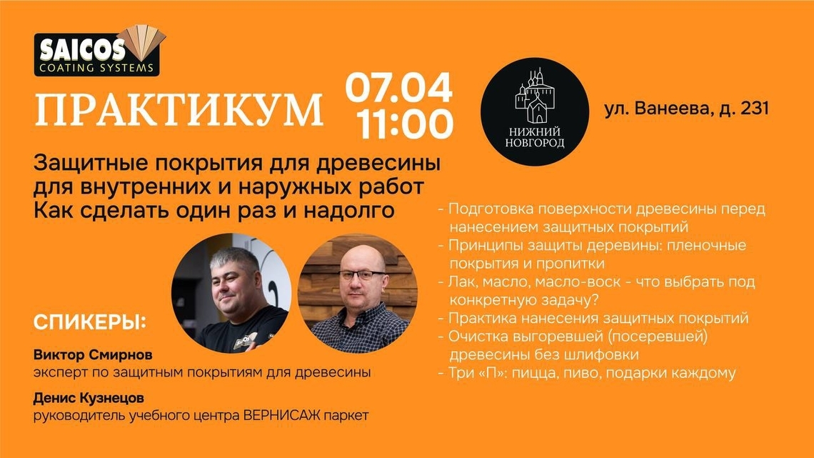 Приглашаем на практикум «Защитные покрытия для древесины для внутренних и наружных работ: как сделать один раз и надолго»!