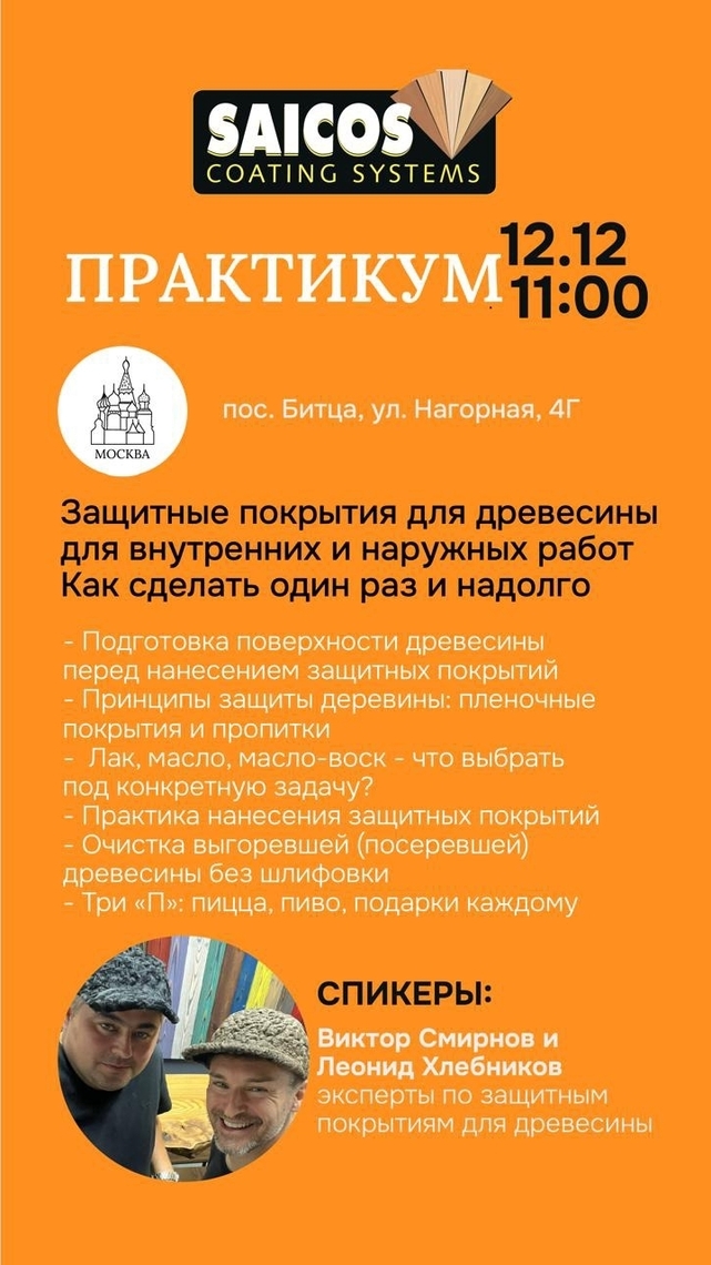 Приглашаем всех желающих на практикум «Защитные покрытия для древесины для внутренних и наружных работ: как сделать один раз и надолго»!