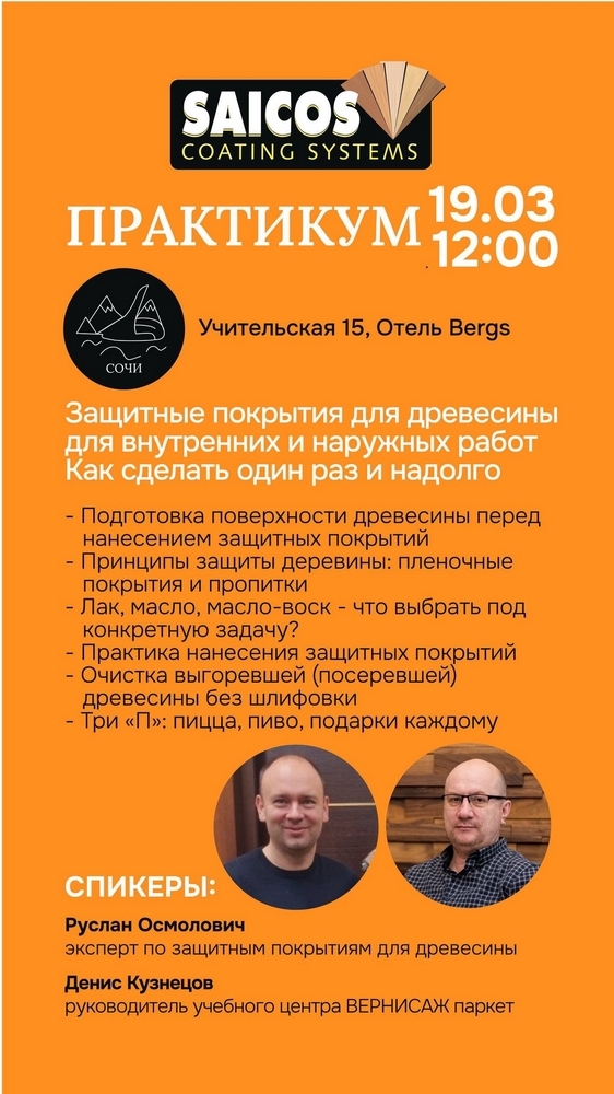 Приглашаем на практикум «Защитные покрытия для древесины для внутренних и наружных работ: как сделать один раз и надолго»!